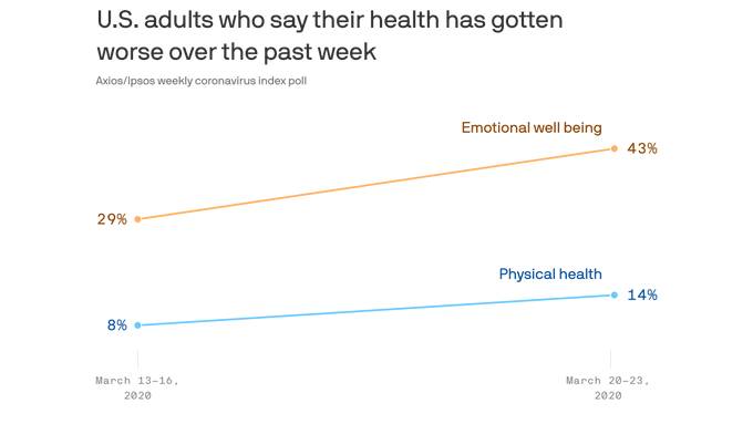 上周,只有29%的受访者表示,他们的情绪状况最近变得更糟了。本周,这一比例上升到43%,相比之下,声称自己身体健康状况恶化的人数增幅要小得多。