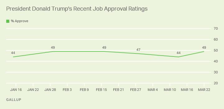 3月25日讯 根据盖洛普民意测验显示,本月特朗普的支持率从44%上升到了49%,这也是他执政以来最高的支持率。