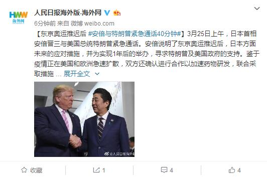 东京奥运推迟后 安倍晋三与特朗普紧急通话40分钟2020-03-25 10:51:31 微博3月25日讯3月25日上午,日本首相安倍晋三与美国总统特