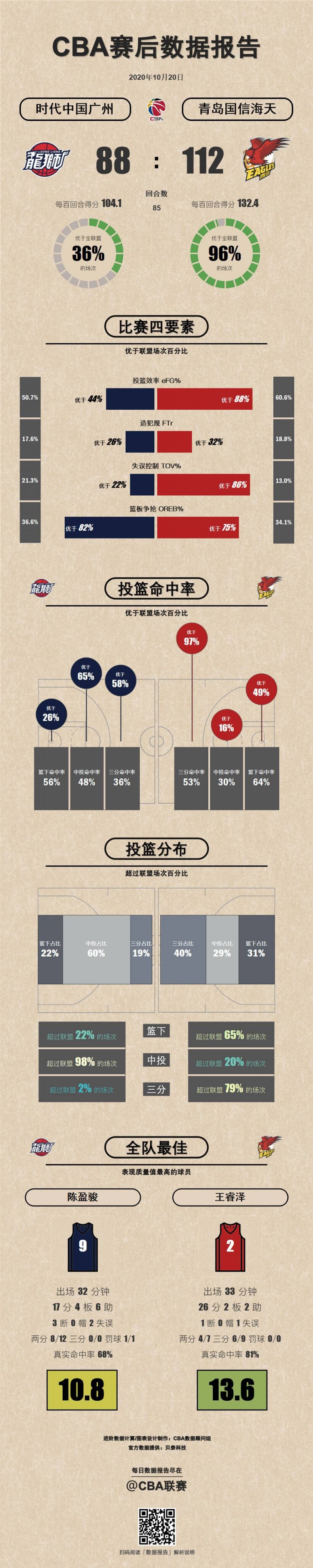10月20日讯今天结束的一场CBA常规赛中,广州88-112不敌青岛。赛后,CBA官方给出了本场比赛的数据报告。