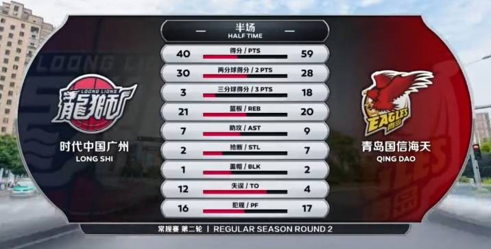 次节,郭凯和陈盈骏上来先后命中中投,青岛继续依靠罚球拿分,赵大鹏反击上篮命中,接着青岛继续利用广州防守漏洞拿分将分差扩大。摩尔抛投打进止血,林韦翰也连续突破拿分,郭凯中投依旧稳定,王庆明一记追身三分后青岛50-30领先20分。陈盈骏和哈斯各追两分,邵英伦空切上篮得手,哈斯篮下暴扣,许家晗三分手起刀落,广州继续依靠中距离追分,邵英伦二次进攻打成2+1,半场结束,青岛59-40大比分领先。