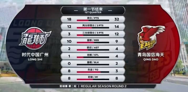 开场后张骋宇率先跳投命中,王睿泽连续开炮拿下5分,陈盈骏急停跳投命中为广州首开纪录,邵英伦外线又是三分命中,此后广州仍旧失误不断,青岛延续攻势以16-2建立领先。陈盈骏连续急停跳投命中,但青岛外线火热又是两记三分中的,祝铭震突破拉杆上进,王睿泽反击飞身暴扣,李炎哲跟进放篮得手,祝铭震跳投再下两分,青岛连续罚球得手,郑准三分一箭穿心,王庆明金鸡独立后仰命中,最后阶段两队频频制造犯规获得罚球,首节结束,青岛32-18领先。