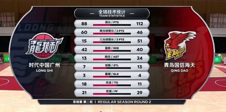 末节,田宇恒反击率先拿分,杨金蒙底角三分弹框而入,摩尔突破抛投得手,刘传兴篮下强打再添两分,青岛外线又是两记三分将分差拉大到30分。李炎哲跟进扣篮得手,杨金蒙快下马上回敬两分,王睿泽三分弹无虚发, 广州无力追分,最终青岛112-88大胜广州。