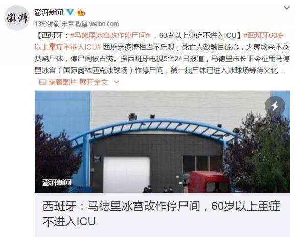 西班牙医生接到命令 60岁+重症病人原则上不能进入ICU2020-03-25 12:29:39 微博3月25日讯 据西班牙《20分钟报》报道,西班牙60岁