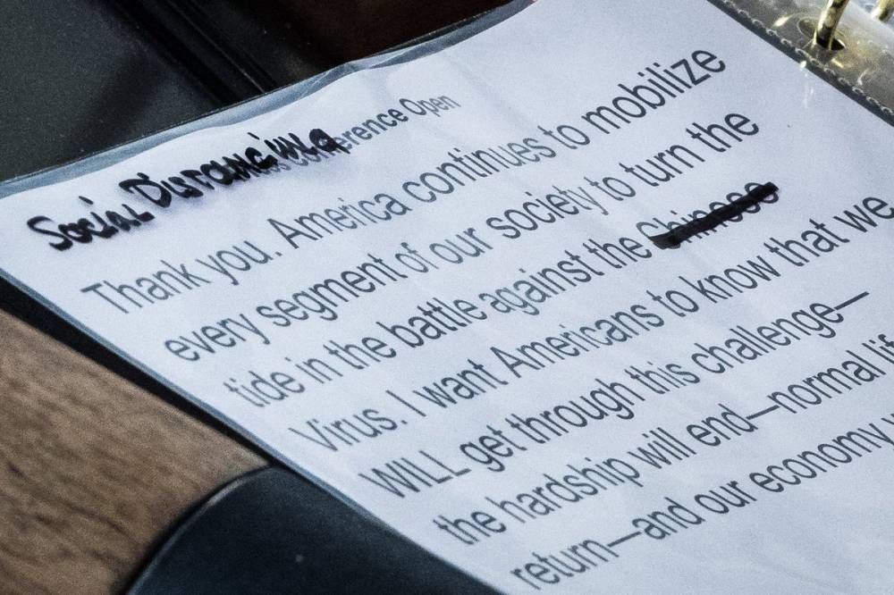 据美国有线电视新闻网(CNN)此前报道,特朗普19日在白宫新闻发布会上的讲稿被记者拍下,照片显示,稿件中的“新冠病毒”被划掉,手写改为了“中国病毒”。