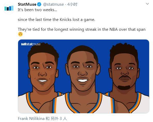 “距离尼克斯上一次输球已经两周了,平这个周期联盟连胜纪录。”Stat Muse写道。