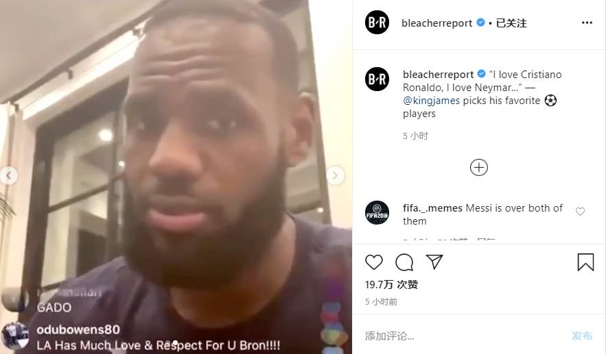 3月25日讯詹姆斯在近日Instagram上与球迷互动时被问到了自己最喜欢哪个足球球星。