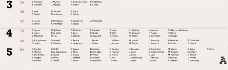 10月22日讯近日,美媒The Athletic对现役NBA球员进行评级,选出了其中前五档的球员。今天给出的是第三档的球员,具体如下: