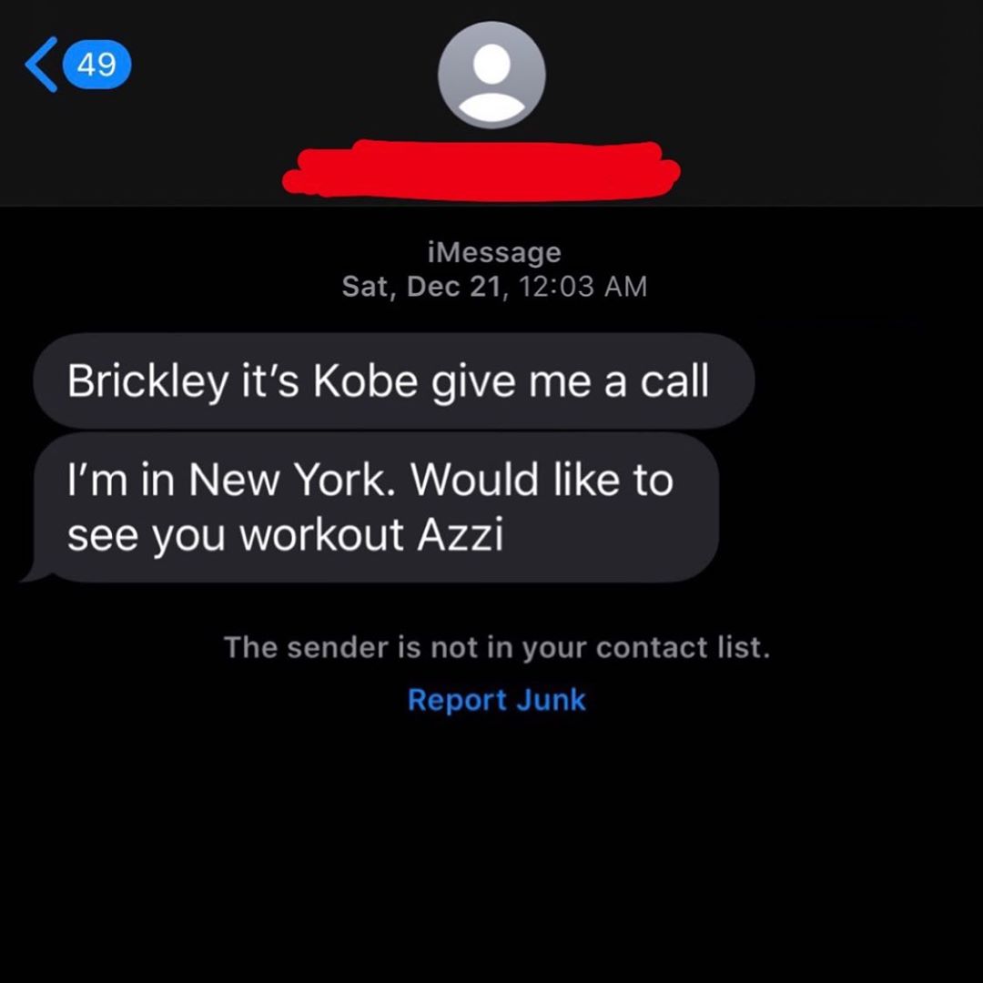 3月25日讯 今日,著名训练师Chris Brickley在社交媒体上发文感叹曾错过科比去年12月份的一条短信,短信内容:“Brickley我是科比,给我回个电话,我在纽约呢,想看看你训练Azzi(Azzi Fudd,2021届全美第一女高中生)。”