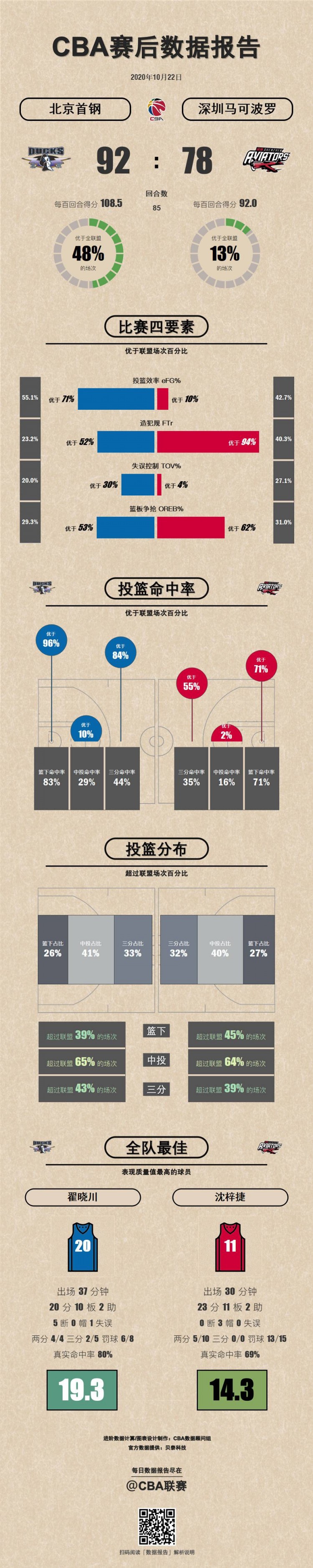 10月22日讯 今晚CBA常规赛,北京以92-78大胜深圳。赛后,CBA官方出具本场比赛数据报告。
