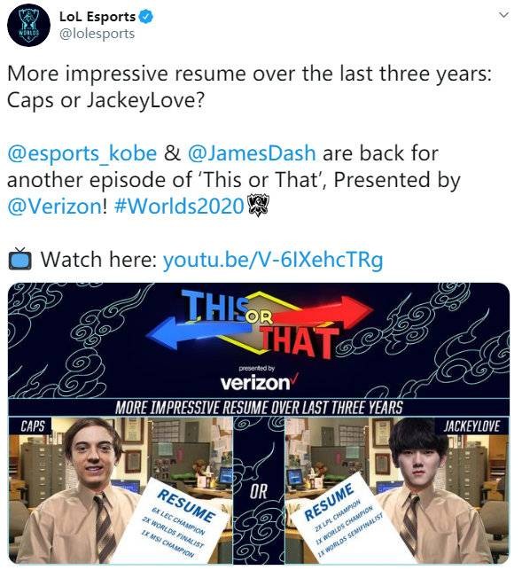 10月22日讯 LOL官推进行了新一轮的“This or That”问题讨论,本期的问题是:过去三年谁的履历(成绩)更好,Caps还是JackeyLove?