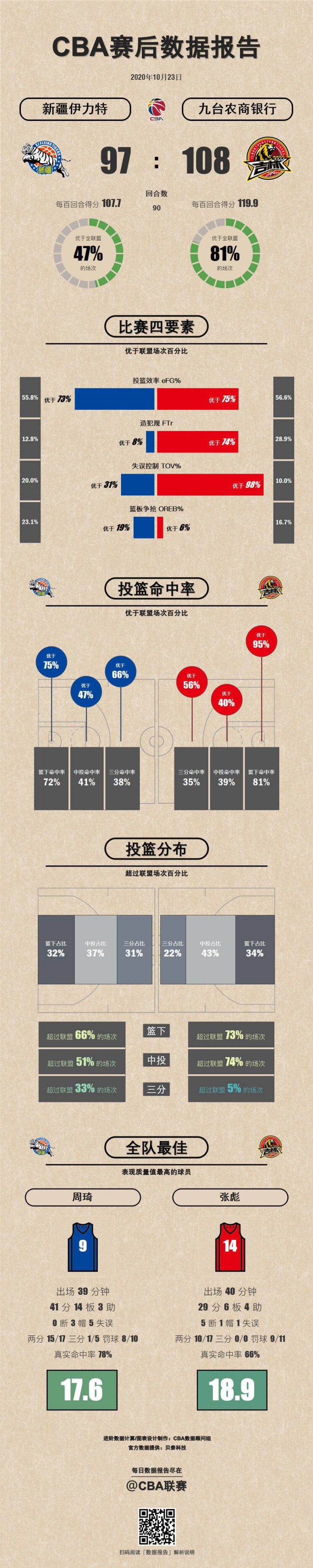 10月23日讯 今天结束的CBA常规赛第3轮,吉林以108-97战胜新疆。赛后,CBA给出本场比赛的数据报告。