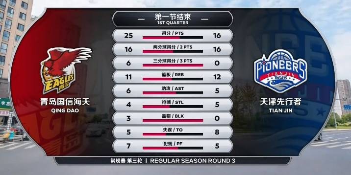 开场后,邵英伦补篮率先拿分,刘伟中投命中,田野突破上篮打进,赵戌宏篮下跟进打成2+1,金鑫溜底线也回应两分,青岛内外开花连得7分以12-6取得领先。刘伟中投止血,刘传兴补篮命中,林庭谦撤步跳投拿分,天津连续出现失误,青岛手感保持不错将分差拉大到11分。时德帅补篮止血,青岛抢攻打进一球,天津再次失误,杨金蒙快下继续拿分,时德帅跟进再放进一球,孟子凯切入篮下压哨打进,首节打完,青岛25-16领先。