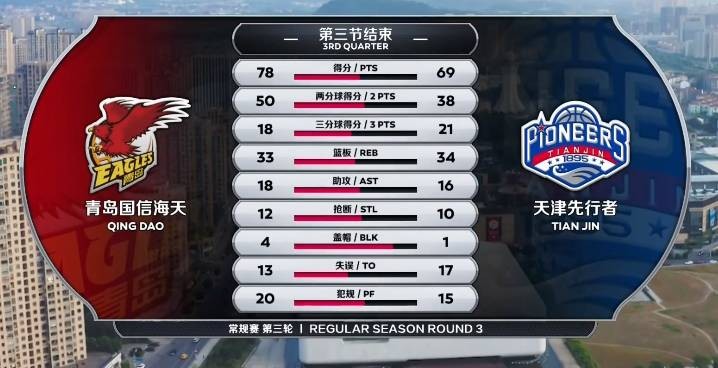 下半场,林韦翰断球率先拿分,接着两队连续不中,史仪突破打三分得手,张骋宇通过跳投连中两球,刘伟扬手命中三分,刘传兴跟进上篮得手,青岛59-50依旧9分优势。天津连续打入篮下追回5分,赵大鹏和张骋宇外线各中一记三分,史仪追身上篮命中,张骋宇抢攻也回敬两分,赵大鹏再中一球,青岛70-59领先到11分。接着两队外线连续对飚三分,刘伟高位跳投命中,王庆明也上篮拿分,金鑫两罚全中,赵戌宏捡漏补篮命中,三节打完,天津69-78仍旧落后。