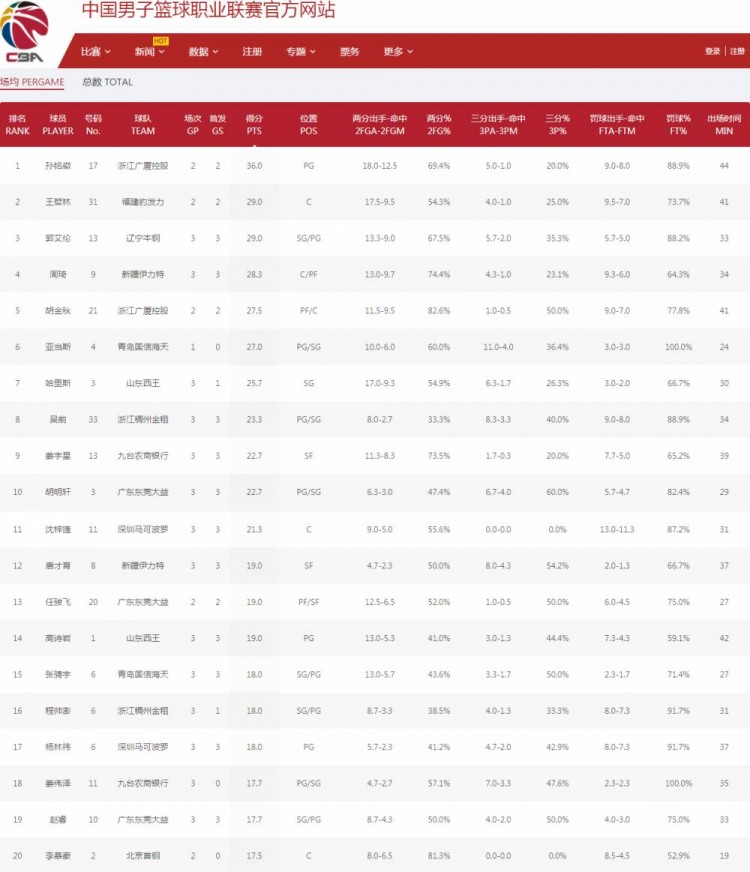 目前联赛3轮战罢,孙铭徽以场均36分高居联赛得分榜首位。值得注意的是,以往“霸榜”的外援们,因为本赛季的外援政策限制,场均得分都十分惨淡——得分榜前20仅有两名外援,前50也就四名外援,甚至还有两名外援场均得分未超过10分,在榜单上排名一百名开外。