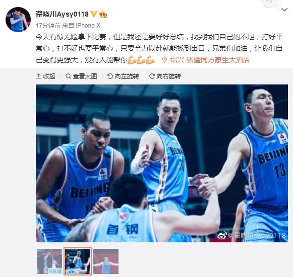 直播吧10月24日讯CBA常规赛第4轮,北京102-99险胜上海。赛后,翟晓川更新个人微博,对本场比赛进行了总结:“今天有惊无险拿下比赛,但是我还是要好好总结,找到我们自己的不足,打好平常心,打不好也