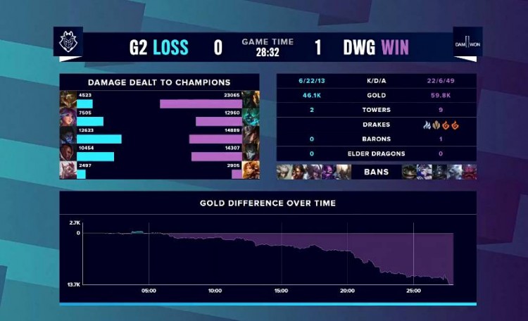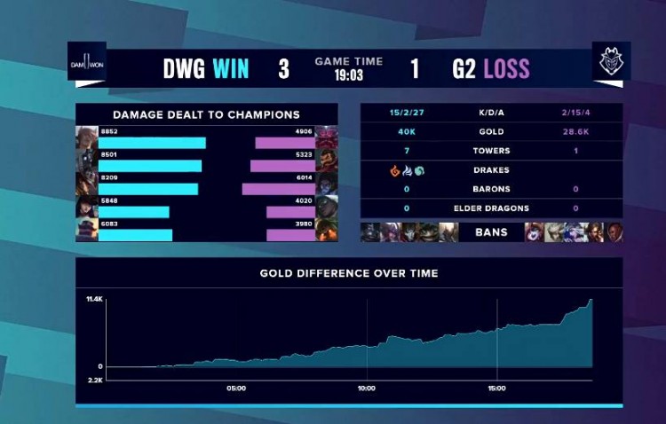 【27:45】DWG推进中路,人马率先开团秒掉莉莉娅,一波团灭G2后结束本局比赛!