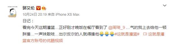 郭艾伦昨晚率先发文:“看完今天这期灌篮,正好刚才晚饭在餐厅看到了周琦,气的我上去给他一顿胖揍,(他)一声妹敢吱,出尔反尔的人就得揍他。”