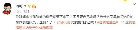 随后,周琦又在今天diss back:“你跳起来打我膝盖的样子我录下来了!不是要自己吃吗?为什么又拿着我送你的东西去抢队员,送别人了? 郭艾伦把我的“腿”还我!”