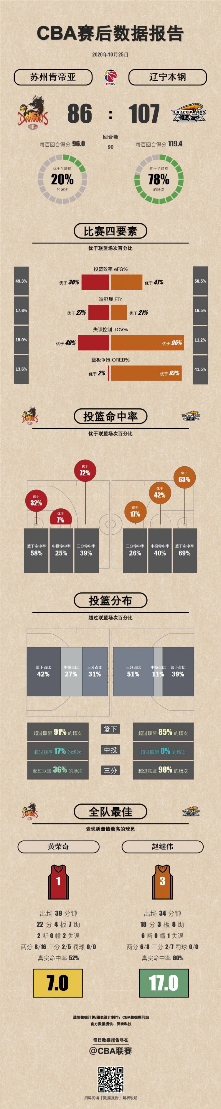 10月25日讯CBA常规赛第4轮,辽宁107-86击败江苏。赛后,CBA官方给出本场比赛的数据报告。