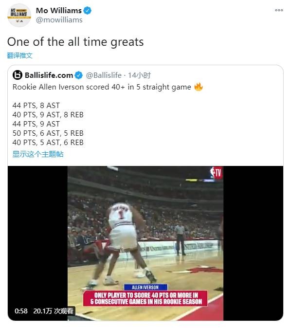 前NBA球员莫-威廉姆斯转发推特,并写道:“NBA历史最佳之一。”