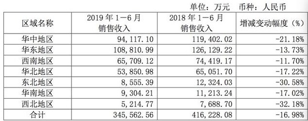 从销售区域来看,2019年上半年,养元饮品所有的销售区域都出现了业绩下滑,其中,华东地区作为公司销售重点,上半年实现销售收入10.88亿元,较上年同期下滑13.73%,其次华中地区实现销售收入9.41亿元,较上年同期下滑21.18%,西南地区实现销售收入6.57亿元,较上年同期下滑11.70%。
