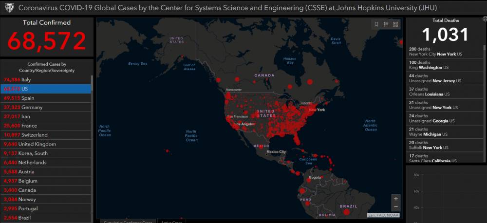 3月26日讯 根据美国约翰斯-霍普金斯大学实时数据显示,美国新冠病毒确诊病例达到了68572例,死亡病例1031例。
