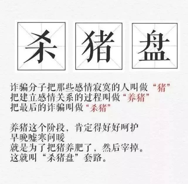 “杀猪盘”是一种博彩网站骗局,他们通常把目标称为“猪”,嘘寒问暖就叫做“养猪”,取得信任后,就着手下一步“杀猪”。