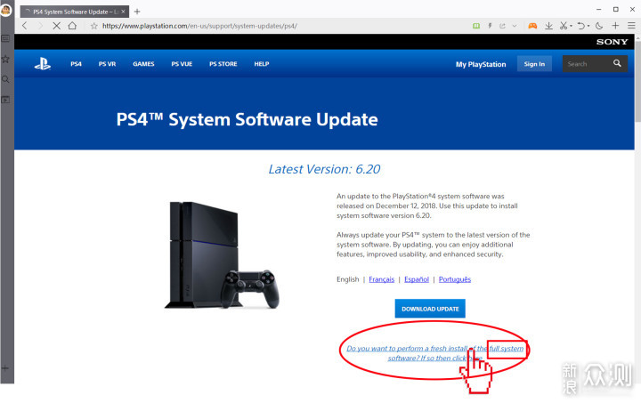 全新硬盘应下载完整固件。在该网页向下浏览,或者点击Full system链接。下载文件名为PS4UPDATA.PUP,大小为979MB的完整固件文件。