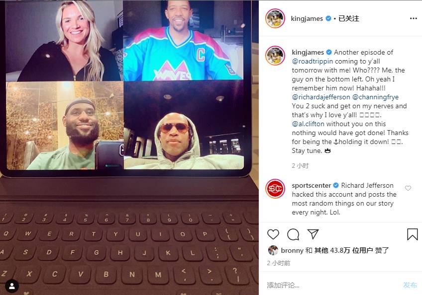 詹姆斯写道:“又一集的Road Trippin即将为你我奉上!谁?我,就是左下角那个家伙,没错,我现在记得他!哈哈哈!@杰弗森@弗莱,你俩让我很紧张,这就是我爱你们的原因。@Allie Clifton(记者,左上)没有你这个不可能完成。”