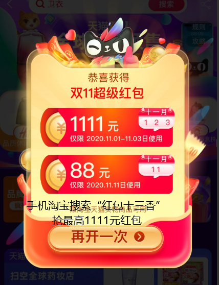 以上红包每天都可以抢3次,抢到双十一,分享给身边的亲朋好友可领更多大额红包,双十一满减、红包补贴、红包雨等买多折扣大、转发越多福利越多的玩法。