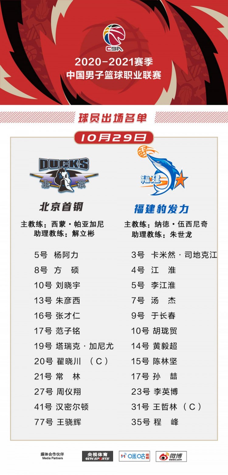 10月29日讯 今晚8点,CBA常规赛第六轮,北京首钢对阵福建豹发力。