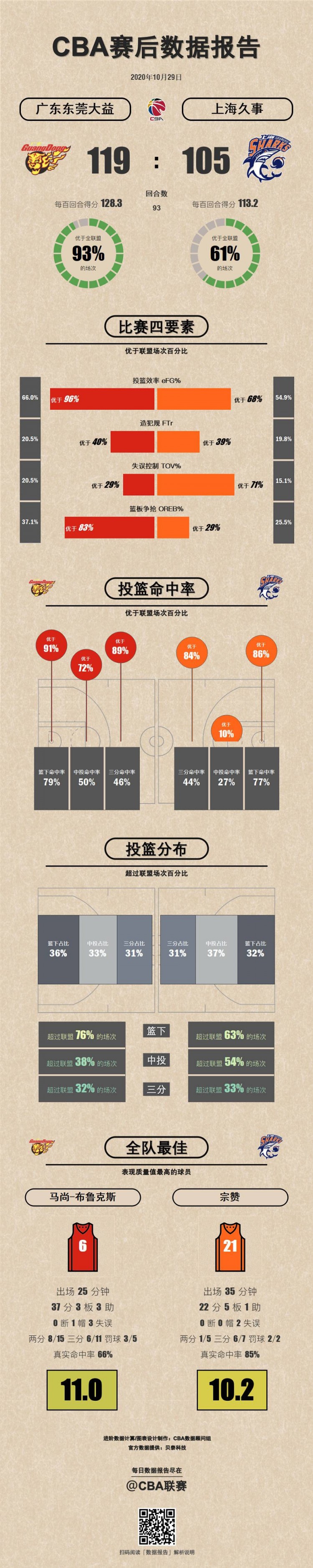 直播吧10月29日讯CBA常规赛第6轮,广东119-105击败上海。赛后,CBA官方给出本场比赛的数据报告。本场比赛广东在投篮效率上和篮板争抢方面表现出色,而上海在失误控制上更胜一筹。本场比赛双方表现