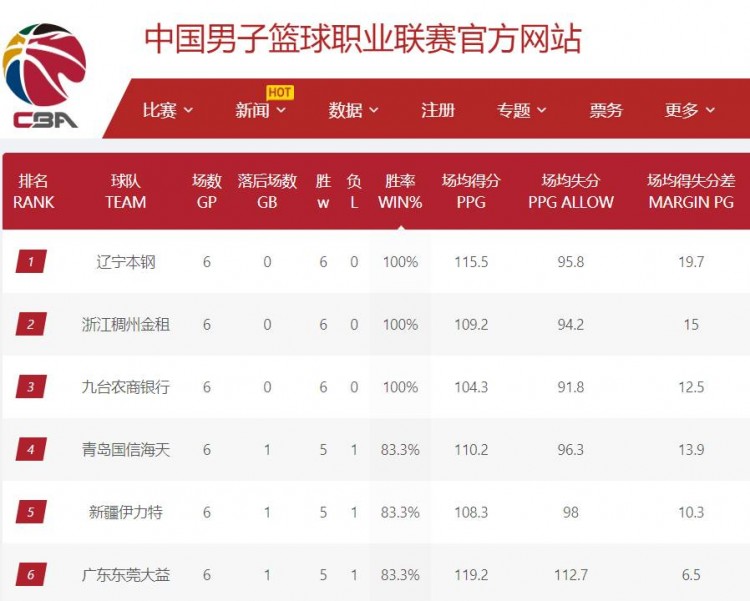 CBA常规赛第6轮今日战罢,本轮之后,辽宁、浙江、吉林三支球队仍保持着各自的不败金身,均以6战全胜领跑战绩榜,而福建和天津仍然没有尝到胜利的滋味。详情如下: