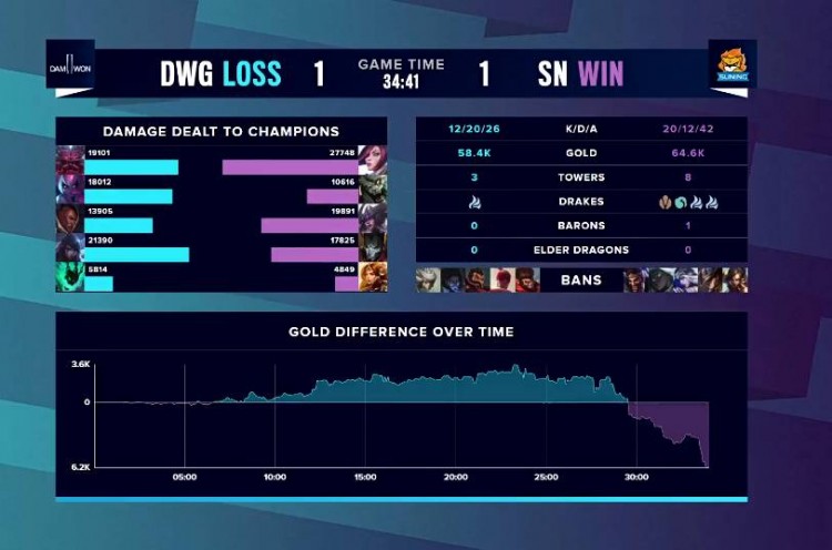 【43:20】带着大龙buff推上上路高地,DWG团战击杀SN多人后结束了本局比赛!