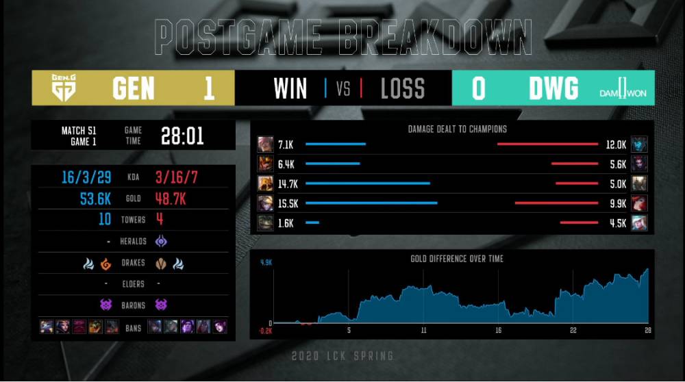 【27:53】DWG强开大龙,GEN前来防守。虽然DWG拿到大龙,但是被GEN团灭,随后GEN一波结束比赛。