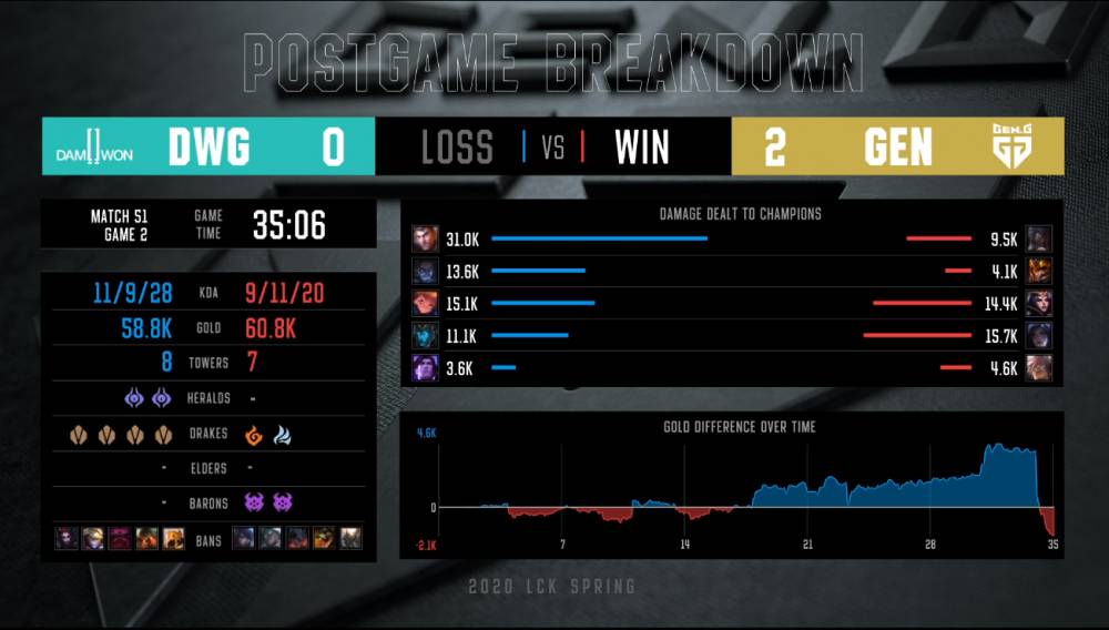 【23:53】GEN利用视野强偷大龙,DWG姗姗来迟大龙已经被收下。DWG持续追击击杀GEN两人。