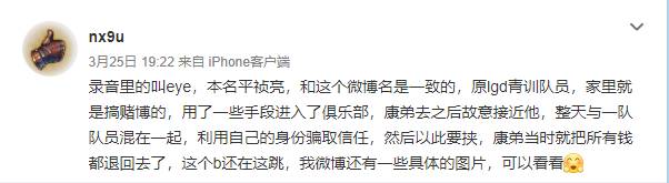 录音里的叫eye,本名平祯亮,和这个微博名是一致的,原lgd青训队员,家里就是搞赌博的,用了一些手段进入了俱乐部,康弟去之后故意接近他,整天与一队队员混在一起,利用自己的身份骗取信任,然后以此要挟,康弟当时就把所有钱都退回去了,这个b还在这跳,我微博还有一些具体的图片,可以看看。
