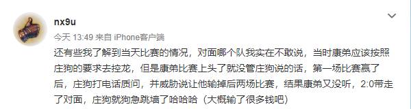 此外这位微博博主还解释了Condi为什么会被举报:还有些我了解到当天比赛的情况,对面哪个队我实在不敢说,当时康弟应该按照庄狗的要求去控龙,但是康弟比赛上头了就没管庄狗说的话,第一场比赛赢了后,庄狗打电话质问,并威胁说让他输掉后两场比赛,结果康弟又没听,2:0带走了对面,庄狗就狗急跳墙了哈哈哈(大概输了很多钱吧)