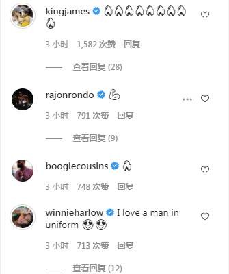 库兹马该动态发布后,包括詹姆斯、隆多、霍华德在内的多名队友都前来评论,库兹马的超模女友Winnie Harlow则回复道:“我喜欢穿制服的男人。”