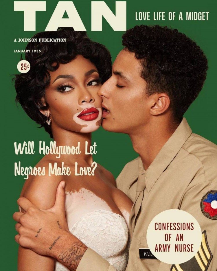 同时,Winnie Harlow也在个人社交媒体发布了致敬其他经典作品的二人合影。