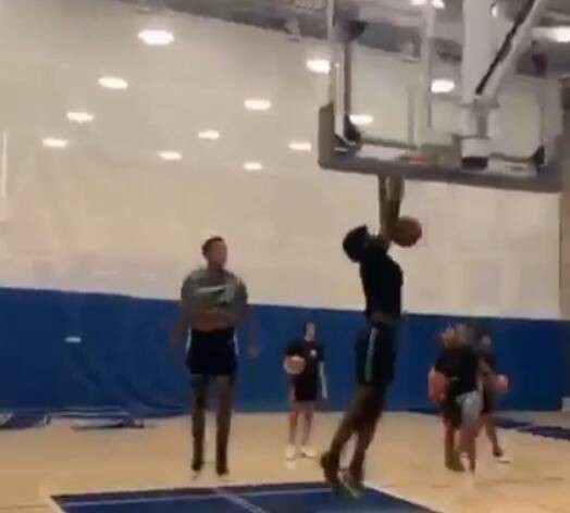 詹姆斯发布的视频中,布朗尼接队友打侧板传球完成双手空接暴扣。