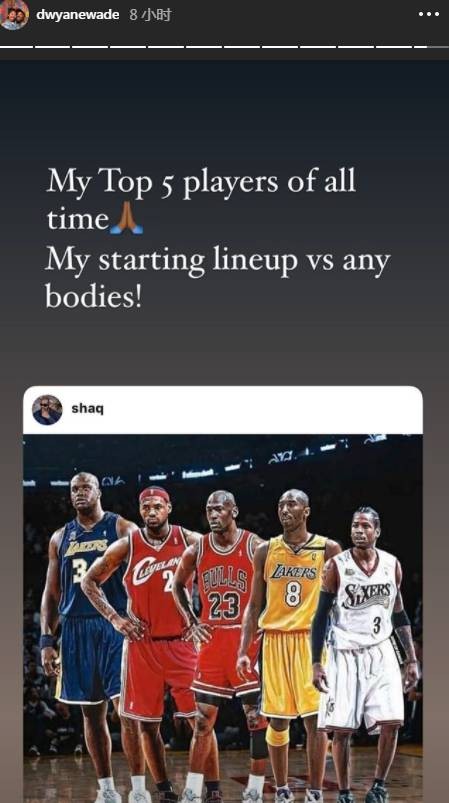韦德转发了奥尼尔此条动态,并写道:“这始终都是我的Top5球员名单,我在面对任何球队时会选出的首发阵容!”