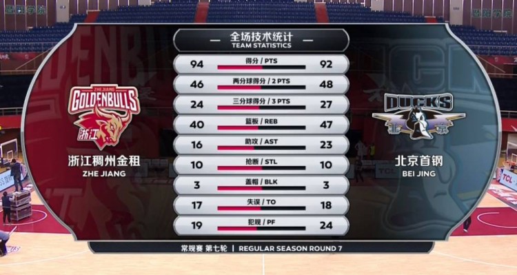 末节开局刘晓宇突分帮助王晓辉命中大空位追平三分,不过浙江也在随后摆脱打铁魔咒由张大宇和王仔路的进球重新取得领先。奈何北京这边外线火力大开,方硕和王晓辉联手命中两记三分打停对手。暂停归来北京依靠翟晓川的2+1占据上风,但回头浙江就通过张大宇的补篮和吴前的三分反超比分。双方一整节都没有取得过绝对意义上的领先,但吴前超强的个人能力是浙江能够反超的关键,朱彦西最后的三分给了北京希望,但浙江守住最后的领先,朱旭航的封盖和吴前最后稳稳两罚将优势扩大至5分奠定胜局,周仪翔最后的三分给了北京希望,随后北京抢断得手更是拿到绝杀球权,不过这一次周仪翔大空位三分绝杀不中。最终,浙江力克北京延续不败战绩,并将连胜扩大至7场。