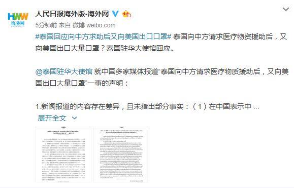 泰国驻华大使馆就中国多家媒体报道“泰国向中方请求医疗物质援助后,又向美国出口大量口罩”一事发布声明:
