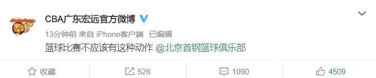 这个犯规出现之后,广东男篮官博直接发文@北京男篮官博,抗议道:“篮球比赛不应该有这种动作 @北京首钢篮球俱乐部”