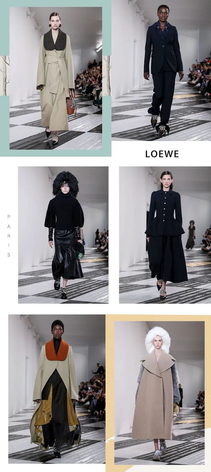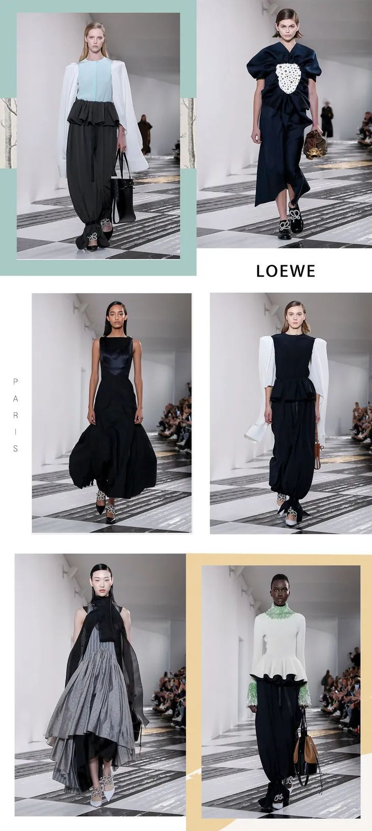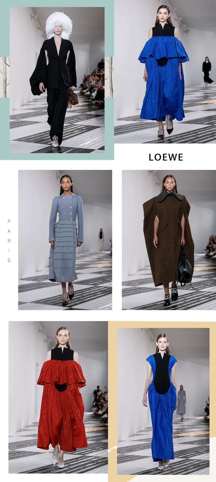 服饰体积是极端的,悬浮或下降的。 纹理并置在光泽、丰富和实用主义为主的羊毛、织锦以及提花丝绸当中,坚实的表面和大胆的图案在混合中达到极致。 当代艺术与古典文艺的碰撞,LOEWE女孩的新衣总是铺满诗情画意。