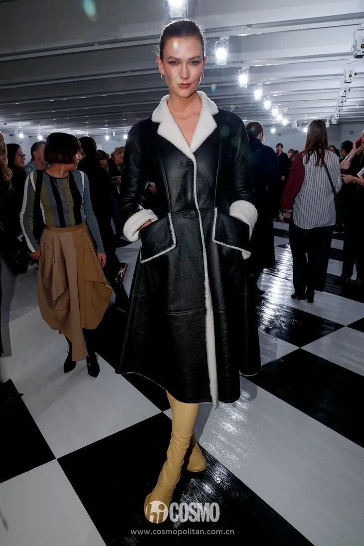 Karlie Kloss的这件长款皮衣简直是为她量身定做的,配上驼色长靴,就算不走秀也能做到分分钟气场两米八。