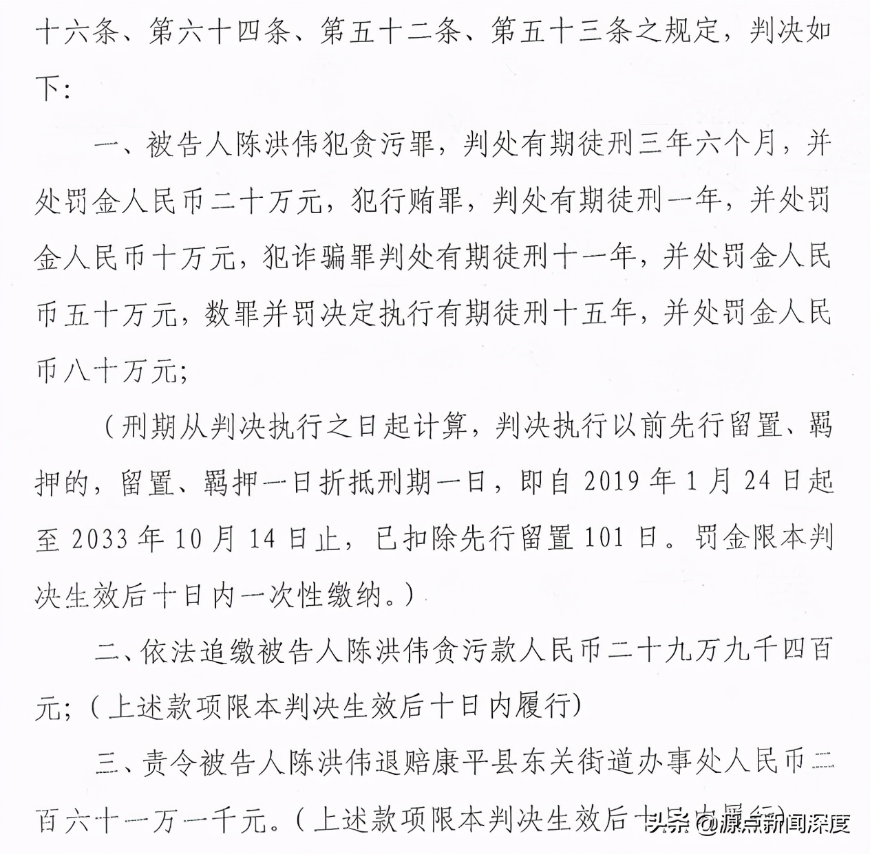 2019年12月30日,辽中区法院审理后一审宣判称,陈洪伟犯贪污罪、行贿罪、诈骗罪,数罪并罚判处15年徒刑,并处罚金80万元,追缴贪污款29.94万元,责令退赔康平县东关街道办事处261.1万元。