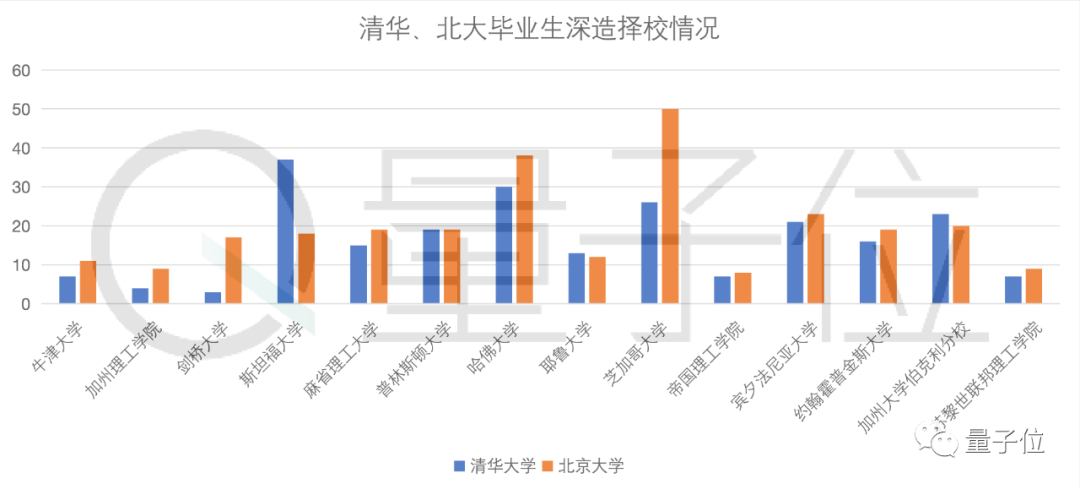 就拿最近的2019年数据来说,根据当年泰晤士全球高校排名,在全球排名前50的高校中,清华大学选择斯坦福人数最多,哈佛次之;而北大人明显更喜欢芝加哥大学,人数明显高于其他院校: